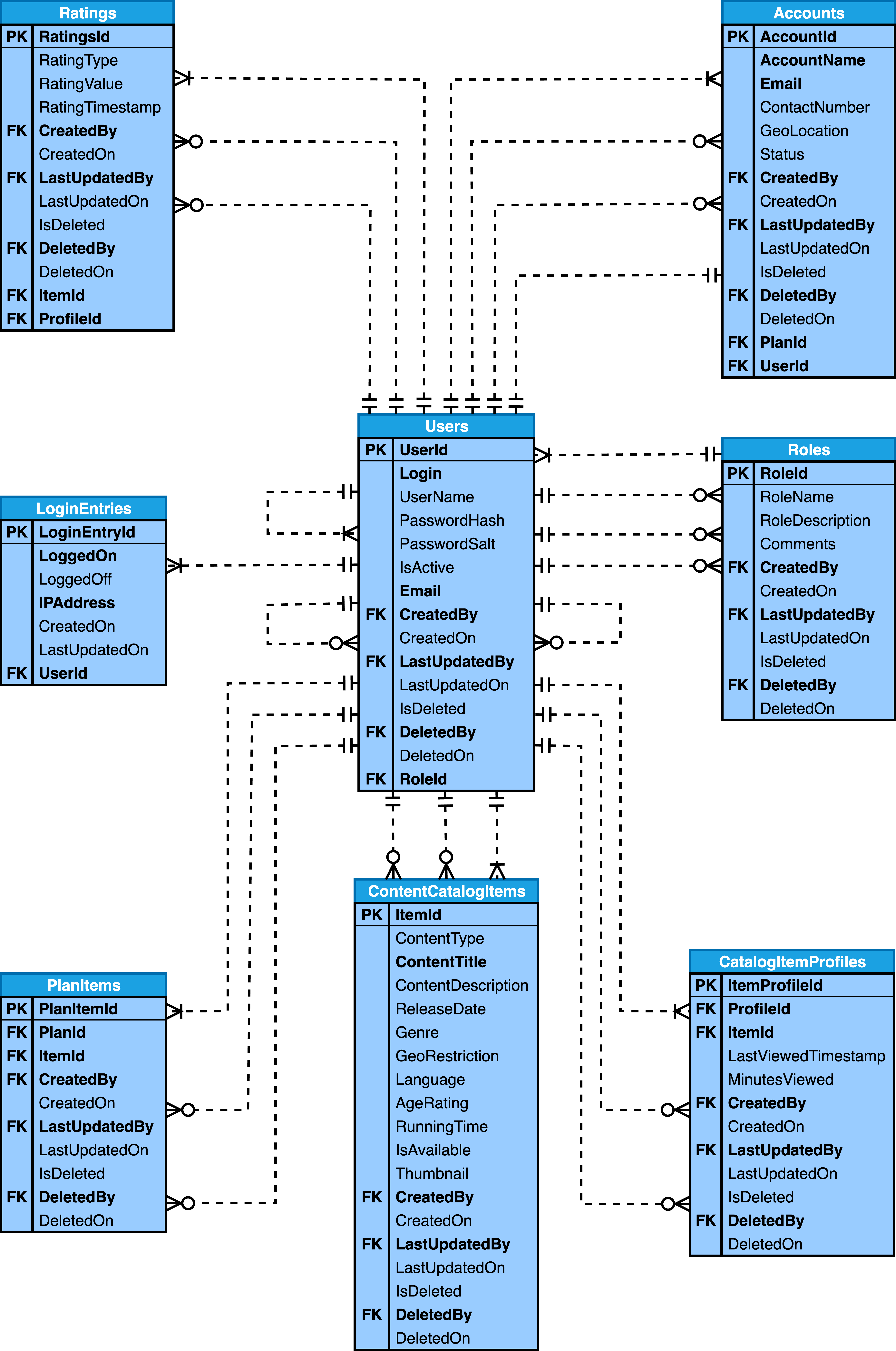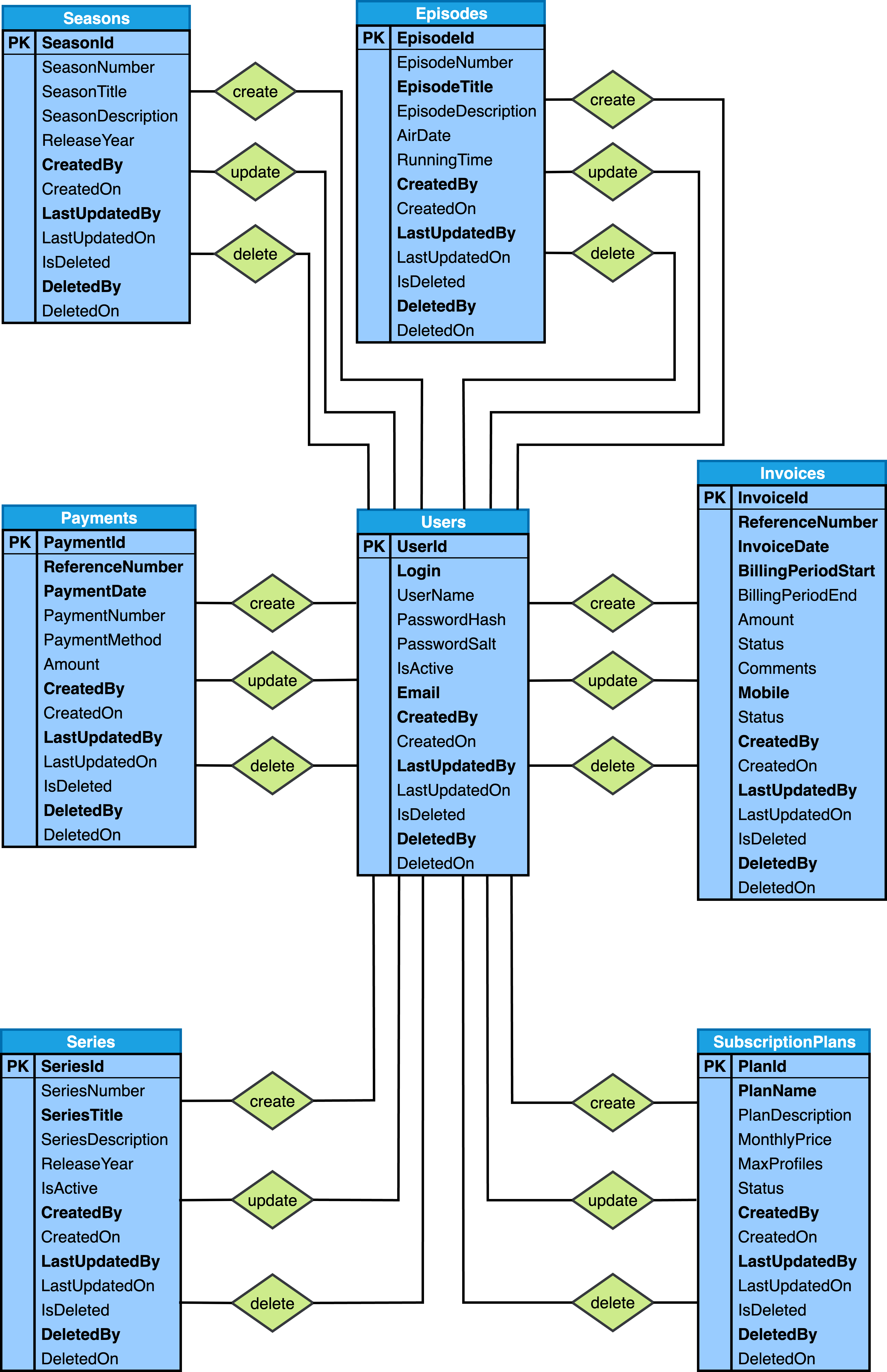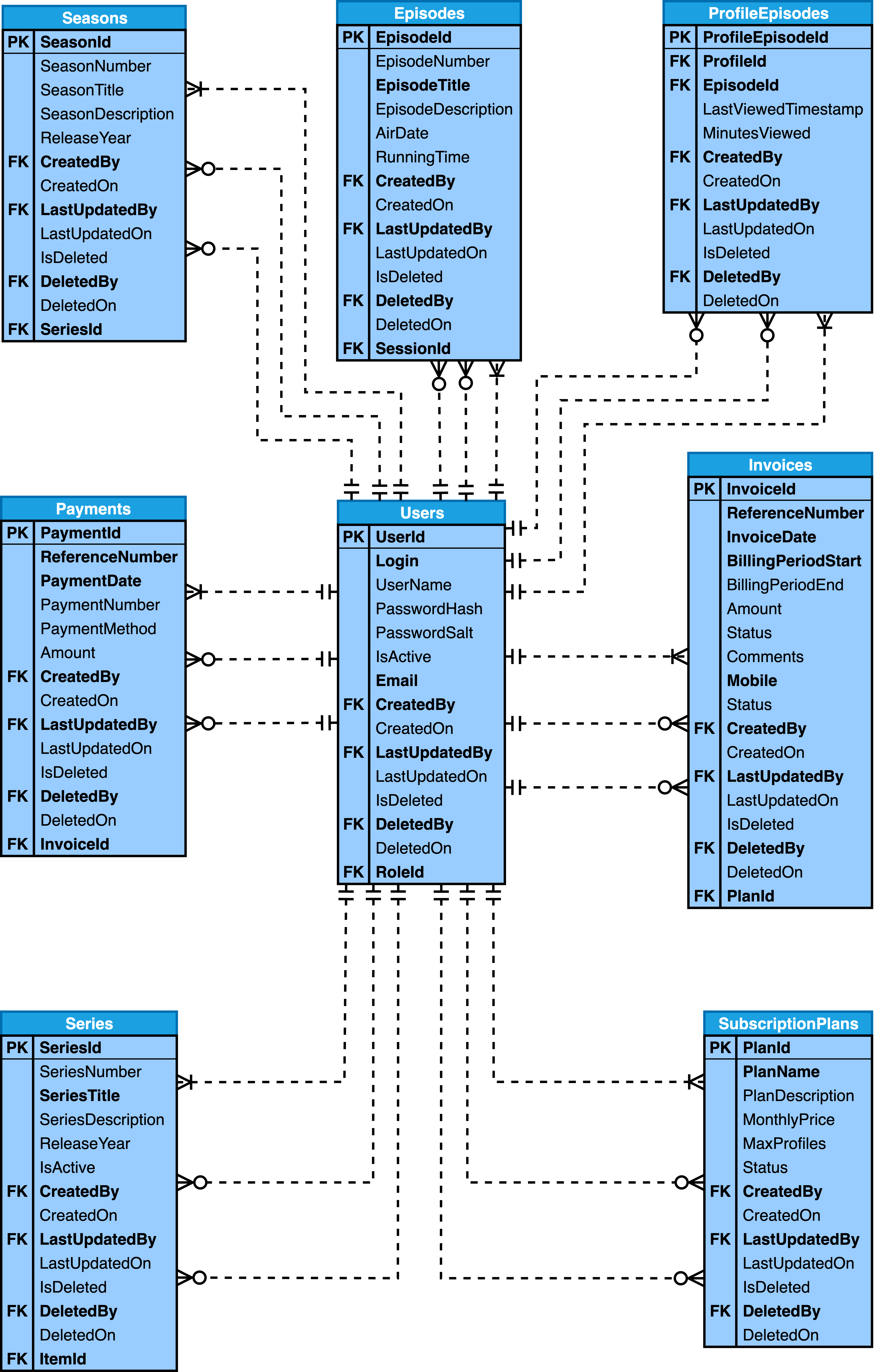 CREATE TABLE Users ( UserId SERIAL, Login VARCHAR(50) NOT NULL, UserName VARCHAR(50) NOT NULL, PasswordHash VARCHAR(255) NOT NULL, PasswordSalt VARCHAR(255) NOT NULL, IsActive BOOLEAN DEFAULT '1', Role VARCHAR(25) NOT NULL, Email VARCHAR(50) NOT NULL, CreatedBy BIGINT UNSIGNED NOT NULL, CreatedOn DATETIME DEFAULT CURRENT_TIMESTAMP, LastUpdatedBy BIGINT UNSIGNED NOT NULL, LastUpdatedOn DATETIME DEFAULT CURRENT_TIMESTAMP ON UPDATE CURRENT_TIMESTAMP, IsDeleted BOOLEAN DEFAULT '0', DeletedBy BIGINT UNSIGNED NULL, DeletedOn DATETIME NULL, PRIMARY KEY (UserId), FOREIGN KEY CreatedBy (CreatedBy) REFERENCES Users (UserId) ON UPDATE CASCADE ON DELETE RESTRICT, FOREIGN KEY LastUpdatedBy (LastUpdatedBy) REFERENCES Users (UserId) ON UPDATE CASCADE ON DELETE RESTRICT, FOREIGN KEY DeletedBy (DeletedBy) REFERENCES Users (UserId) ON UPDATE CASCADE ON DELETE RESTRICT, UNIQUE INDEX Login (Login), UNIQUE INDEX Email (Email) ); CREATE TABLE LoginEntries ( LogEntryId SERIAL, LoggedOn DATETIME DEFAULT CURRENT_TIMESTAMP, LoggedOff DATETIME DEFAULT NULL, IPAddress VARCHAR(46) NOT NULL, CreatedOn DATETIME DEFAULT CURRENT_TIMESTAMP, LastUpdatedOn DATETIME DEFAULT CURRENT_TIMESTAMP ON UPDATE CURRENT_TIMESTAMP, UserId BIGINT UNSIGNED NOT NULL, PRIMARY KEY (LogEntryId), FOREIGN KEY UserId (UserId) REFERENCES Users (UserId) ON UPDATE CASCADE ON DELETE RESTRICT, INDEX LoggedOn (LoggedOn) ); CREATE TABLE ContentCatalogItems ( ItemId SERIAL, ContentType VARCHAR(20) DEFAULT 'Movie', ContentTitle VARCHAR(255) NOT NULL, ContentDescription VARCHAR(1000) NOT NULL, ReleaseDate DATE NOT NULL, Genre VARCHAR(20) DEFAULT 'Drama', GeoRestriction BOOLEAN DEFAULT '0', Language VARCHAR(20) DEFAULT 'English', AgeRating VARCHAR(10) DEFAULT 'PG', RunningTime INTEGER DEFAULT 10, IsAvailable BOOLEAN DEFAULT '1', Thumbnail VARCHAR(2000) DEFAULT NULL, CreatedBy BIGINT UNSIGNED NOT NULL, CreatedOn DATETIME DEFAULT CURRENT_TIMESTAMP, LastUpdatedBy BIGINT UNSIGNED NOT NULL, LastUpdatedOn DATETIME DEFAULT CURRENT_TIMESTAMP ON UPDATE CURRENT_TIMESTAMP, IsDeleted BOOLEAN DEFAULT '0', DeletedBy BIGINT UNSIGNED NULL, DeletedOn DATETIME NULL, PRIMARY KEY (ItemId), INDEX ContentTitle (ContentTitle), FOREIGN KEY CreatedBy (CreatedBy) REFERENCES Users (UserId) ON UPDATE CASCADE ON DELETE RESTRICT, FOREIGN KEY LastUpdatedBy (LastUpdatedBy) REFERENCES Users (UserId) ON UPDATE CASCADE ON DELETE RESTRICT, FOREIGN KEY DeletedBy (DeletedBy) REFERENCES Users (UserId) ON UPDATE CASCADE ON DELETE RESTRICT ); CREATE TABLE SubscriptionPlans ( PlanId SERIAL, PlanName VARCHAR(50) DEFAULT 'Basic', PlanDescription VARCHAR(1000) DEFAULT 'Basic', MonthlyPrice DECIMAL(8,2) DEFAULT '0.00', MaxProfiles SMALLINT DEFAULT 3, Status VARCHAR(20) DEFAULT 'Active', CreatedBy BIGINT UNSIGNED NOT NULL, CreatedOn DATETIME DEFAULT CURRENT_TIMESTAMP, LastUpdatedBy BIGINT UNSIGNED NOT NULL, LastUpdatedOn DATETIME DEFAULT CURRENT_TIMESTAMP ON UPDATE CURRENT_TIMESTAMP, IsDeleted BOOLEAN DEFAULT '0', DeletedBy BIGINT UNSIGNED NULL, DeletedOn DATETIME NULL, PRIMARY KEY (PlanId), INDEX PlanName (PlanName), FOREIGN KEY CreatedBy (CreatedBy) REFERENCES Users (UserId) ON UPDATE CASCADE ON DELETE RESTRICT, FOREIGN KEY LastUpdatedBy (LastUpdatedBy) REFERENCES Users (UserId) ON UPDATE CASCADE ON DELETE RESTRICT, FOREIGN KEY DeletedBy (DeletedBy) REFERENCES Users (UserId) ON UPDATE CASCADE ON DELETE RESTRICT ); CREATE TABLE Invoices ( InvoiceId SERIAL, ReferenceNumber BIGINT UNSIGNED NOT NULL, InvoiceDate DATETIME DEFAULT CURRENT_TIMESTAMP, BillingPeriodStart DATE NOT NULL, BillingPeriodEnd DATE NOT NULL, Amount DECIMAL(8,2) DEFAULT '0.00', Status VARCHAR(20) DEFAULT 'Up to Date', Comments VARCHAR(1000) NOT NULL, PlanId BIGINT UNSIGNED NOT NULL, CreatedBy BIGINT UNSIGNED NOT NULL, CreatedOn DATETIME DEFAULT CURRENT_TIMESTAMP, LastUpdatedBy BIGINT UNSIGNED NOT NULL, LastUpdatedOn DATETIME DEFAULT CURRENT_TIMESTAMP ON UPDATE CURRENT_TIMESTAMP, IsDeleted BOOLEAN DEFAULT '0', DeletedBy BIGINT UNSIGNED NULL, DeletedOn DATETIME NULL, PRIMARY KEY (InvoiceId), UNIQUE INDEX ReferenceNumber (ReferenceNumber), INDEX InvoiceDate (InvoiceDate), INDEX BillingPeriodStart (BillingPeriodStart), FOREIGN KEY CreatedBy (CreatedBy) REFERENCES Users (UserId) ON UPDATE CASCADE ON DELETE RESTRICT, FOREIGN KEY LastUpdatedBy (LastUpdatedBy) REFERENCES Users (UserId) ON UPDATE CASCADE ON DELETE RESTRICT, FOREIGN KEY DeletedBy (DeletedBy) REFERENCES Users (UserId) ON UPDATE CASCADE ON DELETE RESTRICT, FOREIGN KEY PlanId (PlanId) REFERENCES SubscriptionPlans (PlanId) ON UPDATE CASCADE ON DELETE RESTRICT ); CREATE TABLE Payments ( PaymentId SERIAL, ReferenceNumber BIGINT UNSIGNED NOT NULL, PaymentDate DATETIME DEFAULT CURRENT_TIMESTAMP, PaymentNumber BIGINT UNSIGNED NOT NULL, PaymentMethod VARCHAR(20) DEFAULT 'Credit Card', Amount DECIMAL(8,2) DEFAULT '0.00', InvoiceId BIGINT UNSIGNED NOT NULL, CreatedBy BIGINT UNSIGNED NOT NULL, CreatedOn DATETIME DEFAULT CURRENT_TIMESTAMP, LastUpdatedBy BIGINT UNSIGNED NOT NULL, LastUpdatedOn DATETIME DEFAULT CURRENT_TIMESTAMP ON UPDATE CURRENT_TIMESTAMP, IsDeleted BOOLEAN DEFAULT '0', DeletedBy BIGINT UNSIGNED NULL, DeletedOn DATETIME NULL, PRIMARY KEY (PaymentId), FOREIGN KEY CreatedBy (CreatedBy) REFERENCES Users (UserId) ON UPDATE CASCADE ON DELETE RESTRICT, FOREIGN KEY LastUpdatedBy (LastUpdatedBy) REFERENCES Users (UserId) ON UPDATE CASCADE ON DELETE RESTRICT, FOREIGN KEY DeletedBy (DeletedBy) REFERENCES Users (UserId) ON UPDATE CASCADE ON DELETE RESTRICT, FOREIGN KEY InvoiceId (InvoiceId) REFERENCES Invoices (InvoiceId) ON UPDATE CASCADE ON DELETE RESTRICT ); CREATE TABLE Series ( SeriesId SERIAL, SeriesNumber SMALLINT DEFAULT 1, SeriesTitle VARCHAR(255) NOT NULL, SeriesDescription VARCHAR(1000) NOT NULL, ReleaseYear DATE NOT NULL, IsActive BOOLEAN DEFAULT '1', ItemId BIGINT UNSIGNED NOT NULL, CreatedBy BIGINT UNSIGNED NOT NULL, CreatedOn DATETIME DEFAULT CURRENT_TIMESTAMP, LastUpdatedBy BIGINT UNSIGNED NOT NULL, LastUpdatedOn DATETIME DEFAULT CURRENT_TIMESTAMP ON UPDATE CURRENT_TIME