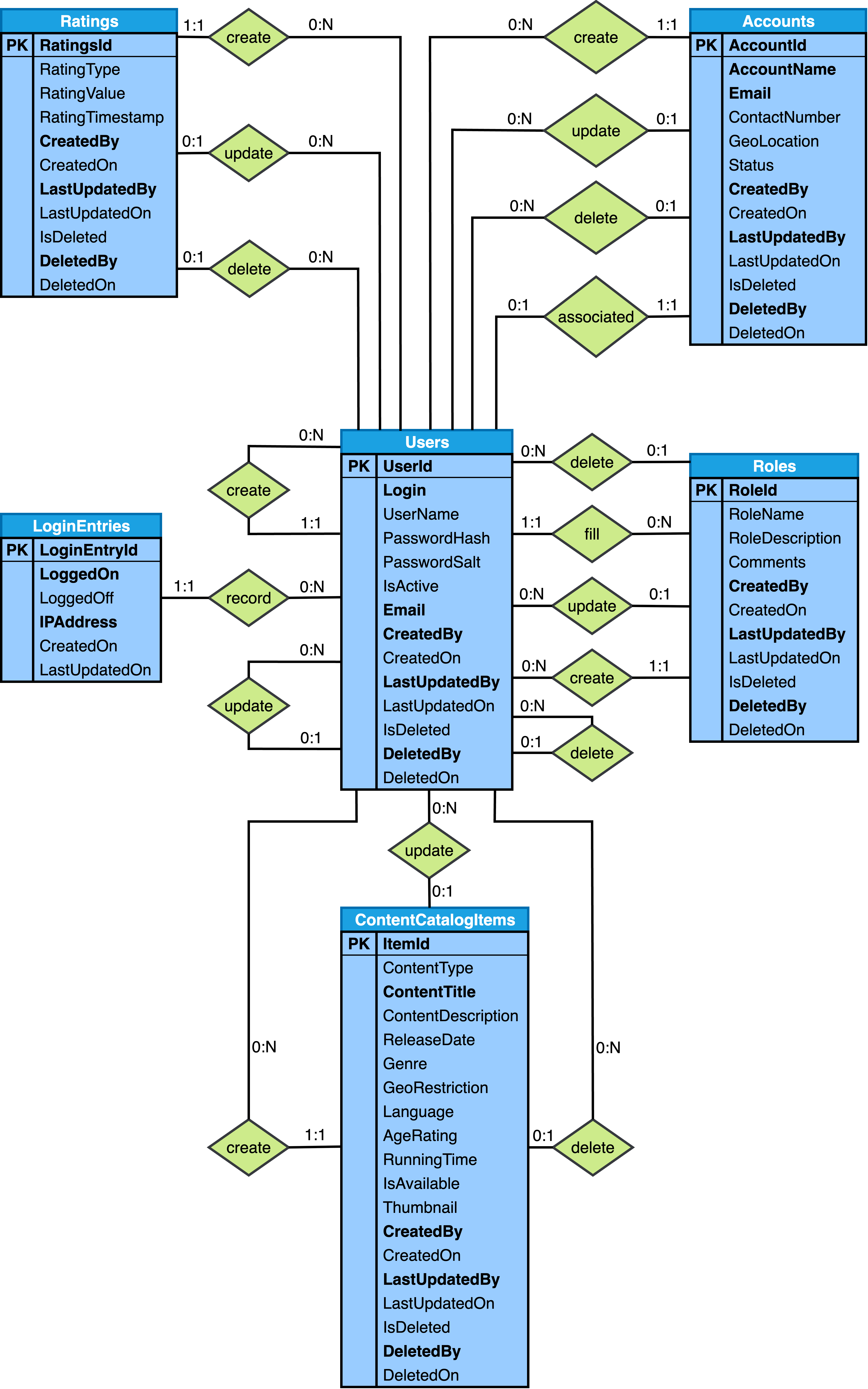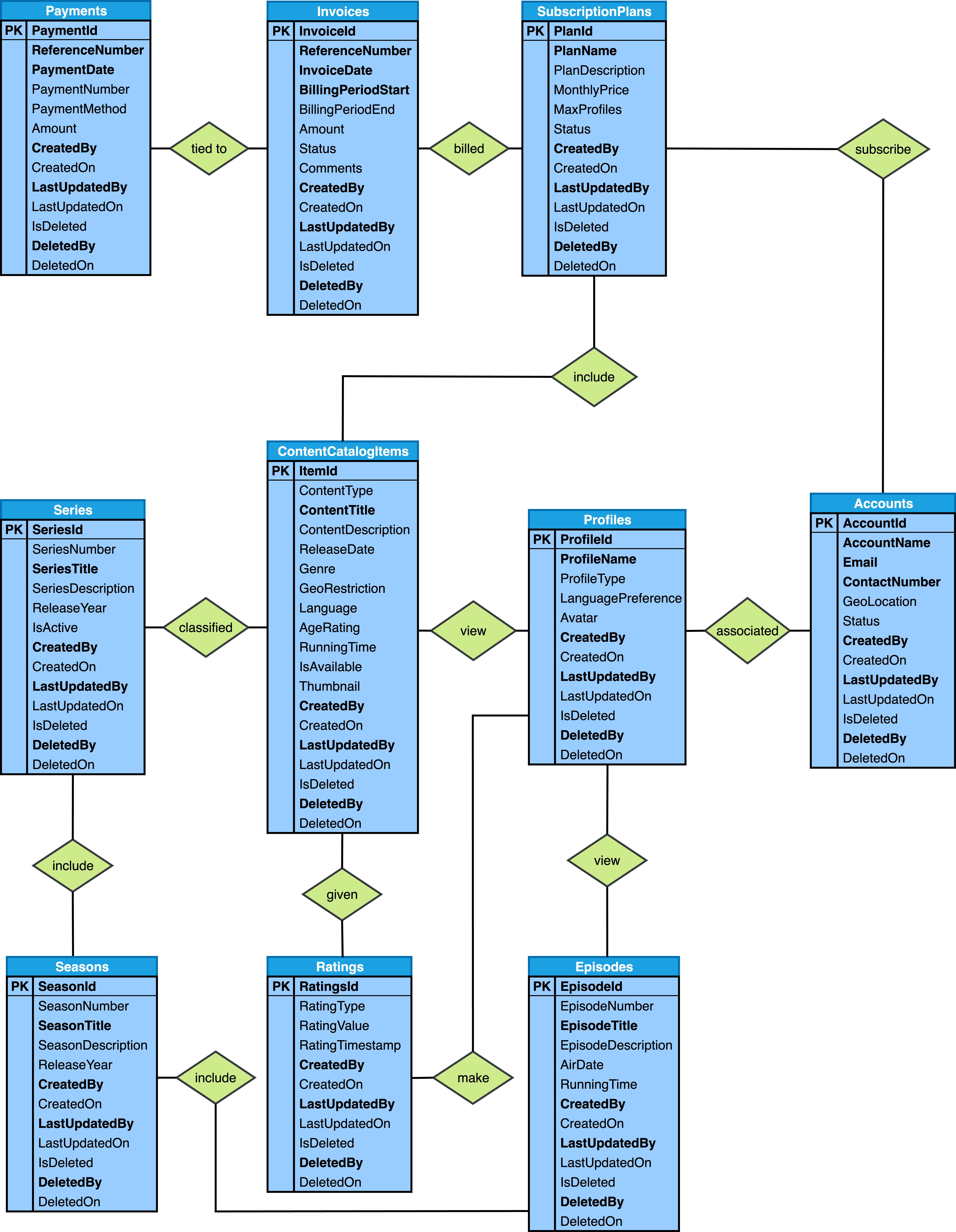 CREATE TABLE Users ( UserId SERIAL, Login VARCHAR(50) NOT NULL, UserName VARCHAR(50) NOT NULL, PasswordHash VARCHAR(255) NOT NULL, PasswordSalt VARCHAR(255) NOT NULL, IsActive BOOLEAN DEFAULT '1', Role VARCHAR(25) NOT NULL, Email VARCHAR(50) NOT NULL, CreatedBy BIGINT UNSIGNED NOT NULL, CreatedOn DATETIME DEFAULT CURRENT_TIMESTAMP, LastUpdatedBy BIGINT UNSIGNED NOT NULL, LastUpdatedOn DATETIME DEFAULT CURRENT_TIMESTAMP ON UPDATE CURRENT_TIMESTAMP, IsDeleted BOOLEAN DEFAULT '0', DeletedBy BIGINT UNSIGNED NULL, DeletedOn DATETIME NULL, PRIMARY KEY (UserId), FOREIGN KEY CreatedBy (CreatedBy) REFERENCES Users (UserId) ON UPDATE CASCADE ON DELETE RESTRICT, FOREIGN KEY LastUpdatedBy (LastUpdatedBy) REFERENCES Users (UserId) ON UPDATE CASCADE ON DELETE RESTRICT, FOREIGN KEY DeletedBy (DeletedBy) REFERENCES Users (UserId) ON UPDATE CASCADE ON DELETE RESTRICT, UNIQUE INDEX Login (Login), UNIQUE INDEX Email (Email) ); CREATE TABLE LoginEntries ( LogEntryId SERIAL, LoggedOn DATETIME DEFAULT CURRENT_TIMESTAMP, LoggedOff DATETIME DEFAULT NULL, IPAddress VARCHAR(46) NOT NULL, CreatedOn DATETIME DEFAULT CURRENT_TIMESTAMP, LastUpdatedOn DATETIME DEFAULT CURRENT_TIMESTAMP ON UPDATE CURRENT_TIMESTAMP, UserId BIGINT UNSIGNED NOT NULL, PRIMARY KEY (LogEntryId), FOREIGN KEY UserId (UserId) REFERENCES Users (UserId) ON UPDATE CASCADE ON DELETE RESTRICT, INDEX LoggedOn (LoggedOn) ); CREATE TABLE ContentCatalogItems ( ItemId SERIAL, ContentType VARCHAR(20) DEFAULT 'Movie', ContentTitle VARCHAR(255) NOT NULL, ContentDescription VARCHAR(1000) NOT NULL, ReleaseDate DATE NOT NULL, Genre VARCHAR(20) DEFAULT 'Drama', GeoRestriction BOOLEAN DEFAULT '0', Language VARCHAR(20) DEFAULT 'English', AgeRating VARCHAR(10) DEFAULT 'PG', RunningTime INTEGER DEFAULT 10, IsAvailable BOOLEAN DEFAULT '1', Thumbnail VARCHAR(2000) DEFAULT NULL, CreatedBy BIGINT UNSIGNED NOT NULL, CreatedOn DATETIME DEFAULT CURRENT_TIMESTAMP, LastUpdatedBy BIGINT UNSIGNED NOT NULL, LastUpdatedOn DATETIME DEFAULT CURRENT_TIMESTAMP ON UPDATE CURRENT_TIMESTAMP, IsDeleted BOOLEAN DEFAULT '0', DeletedBy BIGINT UNSIGNED NULL, DeletedOn DATETIME NULL, PRIMARY KEY (ItemId), INDEX ContentTitle (ContentTitle), FOREIGN KEY CreatedBy (CreatedBy) REFERENCES Users (UserId) ON UPDATE CASCADE ON DELETE RESTRICT, FOREIGN KEY LastUpdatedBy (LastUpdatedBy) REFERENCES Users (UserId) ON UPDATE CASCADE ON DELETE RESTRICT, FOREIGN KEY DeletedBy (DeletedBy) REFERENCES Users (UserId) ON UPDATE CASCADE ON DELETE RESTRICT ); CREATE TABLE SubscriptionPlans ( PlanId SERIAL, PlanName VARCHAR(50) DEFAULT 'Basic', PlanDescription VARCHAR(1000) DEFAULT 'Basic', MonthlyPrice DECIMAL(8,2) DEFAULT '0.00', MaxProfiles SMALLINT DEFAULT 3, Status VARCHAR(20) DEFAULT 'Active', CreatedBy BIGINT UNSIGNED NOT NULL, CreatedOn DATETIME DEFAULT CURRENT_TIMESTAMP, LastUpdatedBy BIGINT UNSIGNED NOT NULL, LastUpdatedOn DATETIME DEFAULT CURRENT_TIMESTAMP ON UPDATE CURRENT_TIMESTAMP, IsDeleted BOOLEAN DEFAULT '0', DeletedBy BIGINT UNSIGNED NULL, DeletedOn DATETIME NULL, PRIMARY KEY (PlanId), INDEX PlanName (PlanName), FOREIGN KEY CreatedBy (CreatedBy) REFERENCES Users (UserId) ON UPDATE CASCADE ON DELETE RESTRICT, FOREIGN KEY LastUpdatedBy (LastUpdatedBy) REFERENCES Users (UserId) ON UPDATE CASCADE ON DELETE RESTRICT, FOREIGN KEY DeletedBy (DeletedBy) REFERENCES Users (UserId) ON UPDATE CASCADE ON DELETE RESTRICT ); CREATE TABLE Invoices ( InvoiceId SERIAL, ReferenceNumber BIGINT UNSIGNED NOT NULL, InvoiceDate DATETIME DEFAULT CURRENT_TIMESTAMP, BillingPeriodStart DATE NOT NULL, BillingPeriodEnd DATE NOT NULL, Amount DECIMAL(8,2) DEFAULT '0.00', Status VARCHAR(20) DEFAULT 'Up to Date', Comments VARCHAR(1000) NOT NULL, PlanId BIGINT UNSIGNED NOT NULL, CreatedBy BIGINT UNSIGNED NOT NULL, CreatedOn DATETIME DEFAULT CURRENT_TIMESTAMP, LastUpdatedBy BIGINT UNSIGNED NOT NULL, LastUpdatedOn DATETIME DEFAULT CURRENT_TIMESTAMP ON UPDATE CURRENT_TIMESTAMP, IsDeleted BOOLEAN DEFAULT '0', DeletedBy BIGINT UNSIGNED NULL, DeletedOn DATETIME NULL, PRIMARY KEY (InvoiceId), UNIQUE INDEX ReferenceNumber (ReferenceNumber), INDEX InvoiceDate (InvoiceDate), INDEX BillingPeriodStart (BillingPeriodStart), FOREIGN KEY CreatedBy (CreatedBy) REFERENCES Users (UserId) ON UPDATE CASCADE ON DELETE RESTRICT, FOREIGN KEY LastUpdatedBy (LastUpdatedBy) REFERENCES Users (UserId) ON UPDATE CASCADE ON DELETE RESTRICT, FOREIGN KEY DeletedBy (DeletedBy) REFERENCES Users (UserId) ON UPDATE CASCADE ON DELETE RESTRICT, FOREIGN KEY PlanId (PlanId) REFERENCES SubscriptionPlans (PlanId) ON UPDATE CASCADE ON DELETE RESTRICT ); CREATE TABLE Payments ( PaymentId SERIAL, ReferenceNumber BIGINT UNSIGNED NOT NULL, PaymentDate DATETIME DEFAULT CURRENT_TIMESTAMP, PaymentNumber BIGINT UNSIGNED NOT NULL, PaymentMethod VARCHAR(20) DEFAULT 'Credit Card', Amount DECIMAL(8,2) DEFAULT '0.00', InvoiceId BIGINT UNSIGNED NOT NULL, CreatedBy BIGINT UNSIGNED NOT NULL, CreatedOn DATETIME DEFAULT CURRENT_TIMESTAMP, LastUpdatedBy BIGINT UNSIGNED NOT NULL, LastUpdatedOn DATETIME DEFAULT CURRENT_TIMESTAMP ON UPDATE CURRENT_TIMESTAMP, IsDeleted BOOLEAN DEFAULT '0', DeletedBy BIGINT UNSIGNED NULL, DeletedOn DATETIME NULL, PRIMARY KEY (PaymentId), FOREIGN KEY CreatedBy (CreatedBy) REFERENCES Users (UserId) ON UPDATE CASCADE ON DELETE RESTRICT, FOREIGN KEY LastUpdatedBy (LastUpdatedBy) REFERENCES Users (UserId) ON UPDATE CASCADE ON DELETE RESTRICT, FOREIGN KEY DeletedBy (DeletedBy) REFERENCES Users (UserId) ON UPDATE CASCADE ON DELETE RESTRICT, FOREIGN KEY InvoiceId (InvoiceId) REFERENCES Invoices (InvoiceId) ON UPDATE CASCADE ON DELETE RESTRICT ); CREATE TABLE Series ( SeriesId SERIAL, SeriesNumber SMALLINT DEFAULT 1, SeriesTitle VARCHAR(255) NOT NULL, SeriesDescription VARCHAR(1000) NOT NULL, ReleaseYear DATE NOT NULL, IsActive BOOLEAN DEFAULT '1', ItemId BIGINT UNSIGNED NOT NULL, CreatedBy BIGINT UNSIGNED NOT NULL, CreatedOn DATETIME DEFAULT CURRENT_TIMESTAMP, LastUpdatedBy BIGINT UNSIGNED NOT NULL, LastUpdatedOn DATETIME DEFAULT CURRENT_TIMESTAMP ON UPDATE CURRENT_TIME